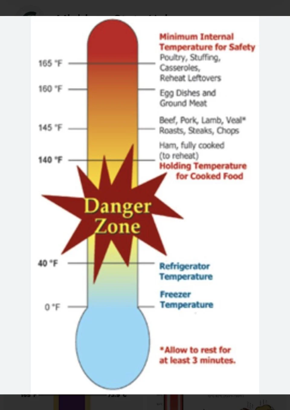 Keeping food safe includes keeping it stored at the right temperature to prevent microorganisms from growing. Specific temperature ranges can make a huge difference. The danger zone which is between 40 degrees F to 140 degrees F, is the temperature range that most infectious germs grow rapidly. Refrigeration, freezing, and thoroughly cooking high risk foods is essential. Which foods have the greatest chance of bacterial contamination? The foods that are high in protein and high in moisture – meat, eggs, dairy, sauces made from cheese, fish, seafood, moisture holding grains like pasta, rice and bread. Of course, all foods have the potential to be dangerous, but some are safer at room temperatures, especially those foods that contain very little moisture, such as seeds and nuts.