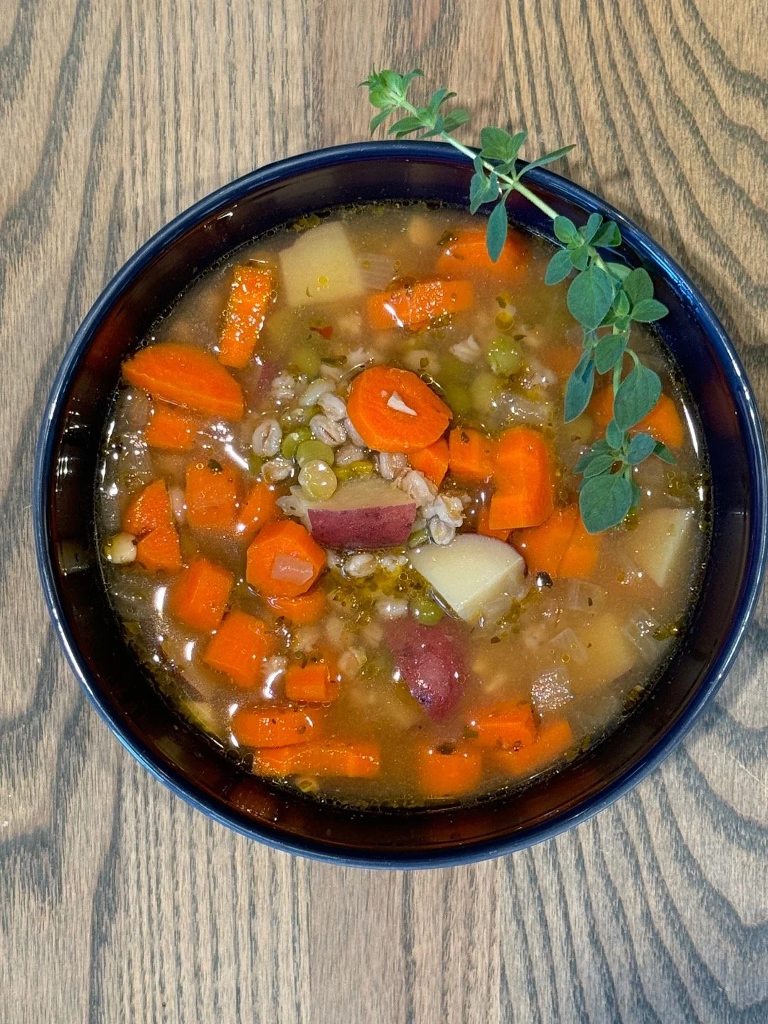 This hearty recipe not only tastes amazing, but it also packs a punch when it comes to a wholesome, nutritious meal. The combination of peas and farro provide all the essential amino acids and lots of needed fiber. The carrots add lots of micronutrients including beta carotene (that can be converted to vitamin A.) Our family has made this recipe for dinner, often. Soup crackers and/or French bread complement this meal, well.