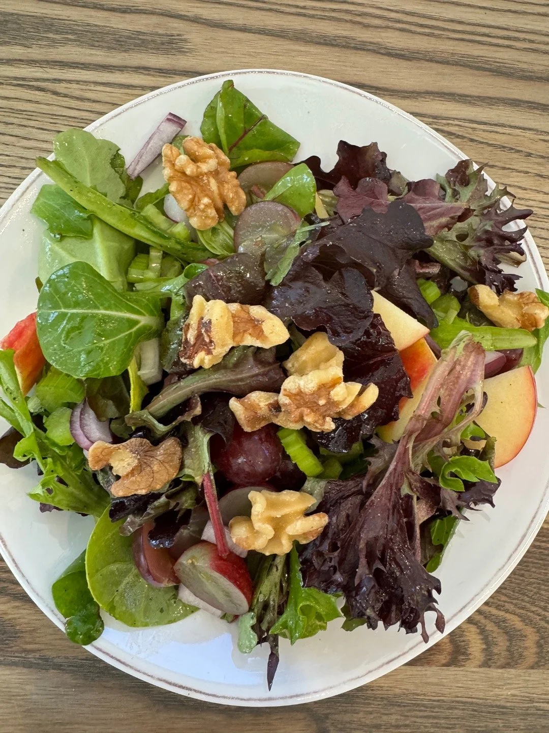 7. Divide the lettuce into 4 servings and place on serving plates. Top each with grapes, apples and walnuts.