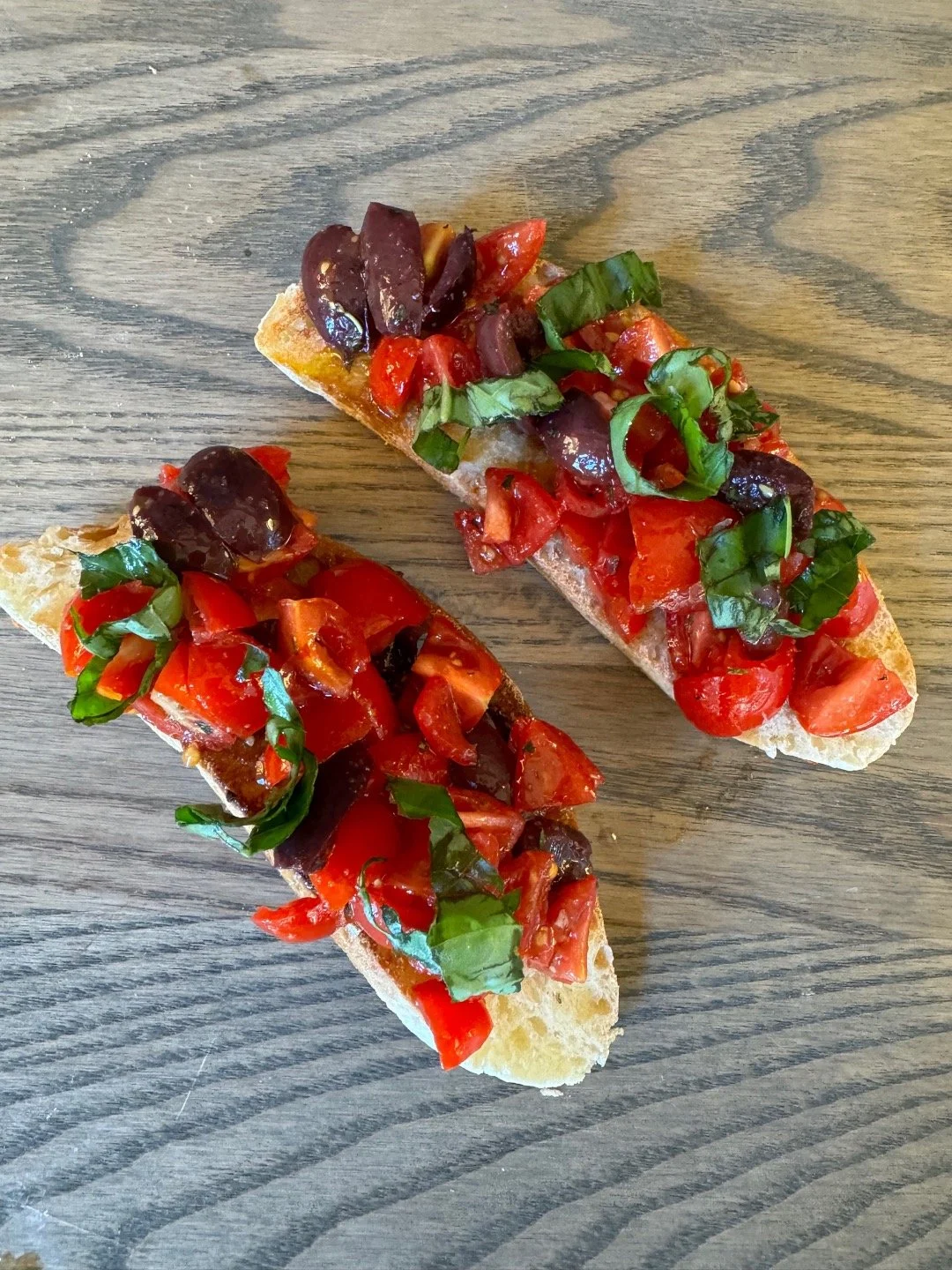 5. Chop tomatoes and olives and place in a medium sized bowl.