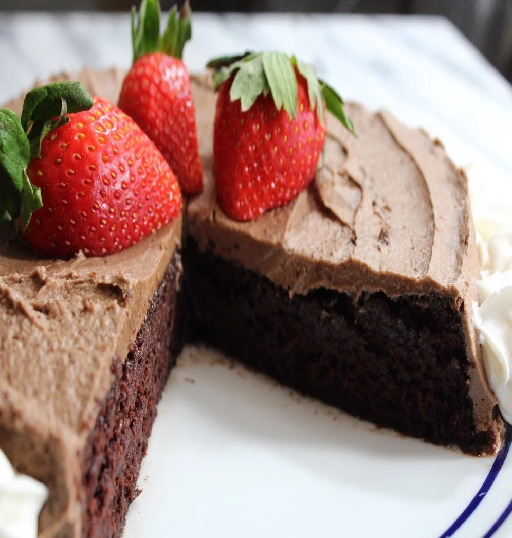 Chocolate Cake with Soy Whipped Cream and Sliced Strawberries